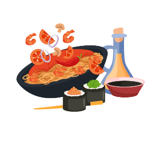 Brokoli , Mantar, Havuç, Taze Soğan, Soya Filizi, Kırmızı Biber, Tavuk , Dana Eti, Karides